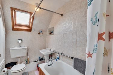 7' 10" x 4' 7" (2.39m x 1.4m) Carpet flooring and linoleum flooring, front aspect wooden frame skylight, fitted bath with shower over, pedestal sink, WC, built-in cupboard, and one radiator
